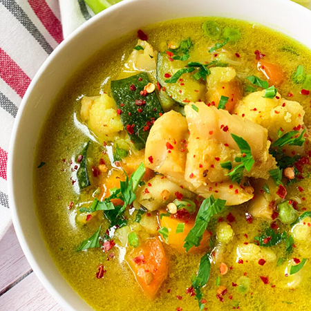 All three types of seafood in this recipe — scallops, shrimp and langostinos — are frozen. Not only does that make them easier to find, but they are also much more affordable. The langostinos can be traded out for white fish if your store doesn’t have them. This is a great soup if you want a creamy soup but want to mostly avoid dairy. Creamed cauliflower is what makes this soup white, not a flour-heavy roux or actual cream. There is a touch of parmesan — so it’s not dairy-free. A serving has 169 calories, 8.4 grams of carbs, 2.4 grams of fiber and 8.1 grams of fat. Get the recipe.